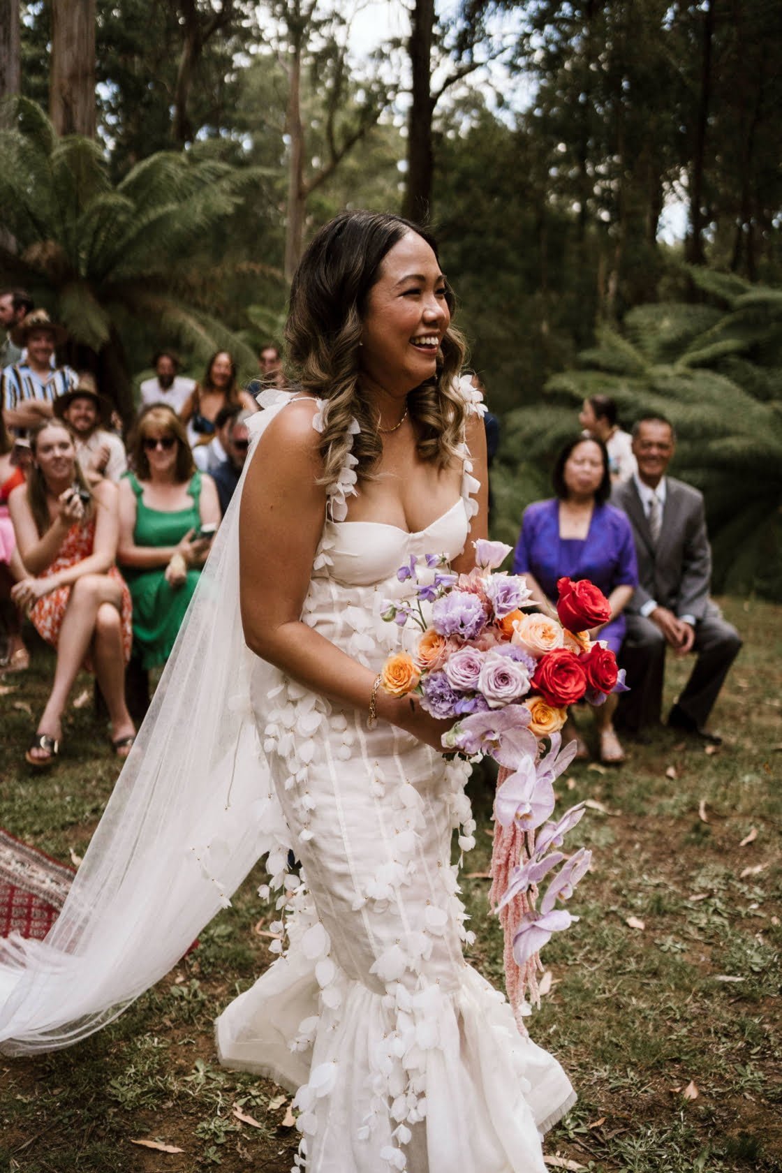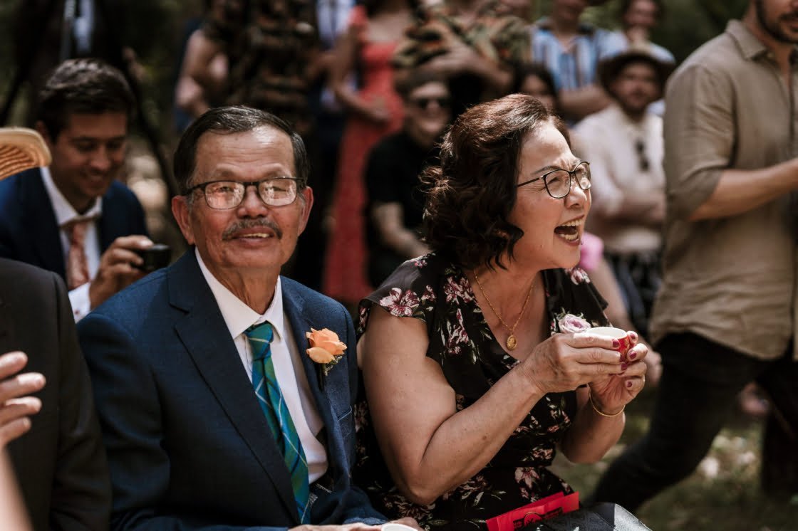 STANDOUT VENDORS “Stina aka Gold and Grit Photography was much more than a photographer and such a calming presence. She wasn’t about forced poses and beautifully captured all the raw moments. Ben, our videographer (Tie The Knot Wedding Films), plays netball with my sister so he felt like an old friend. Christine Kha, our very bubbly celebrant, made our ceremony extra special as she was able to incorporate Asian traditions the way we wanted to and taught us to say ‘I do’ in Cantonese, which was one of my favourite/ funniest moments of the day. We also really connected with Toolangi Heights owners Brendan and Edwina – we were the first to have a wedding there in two years and they really went above and beyond to make sure everything was perfect.”