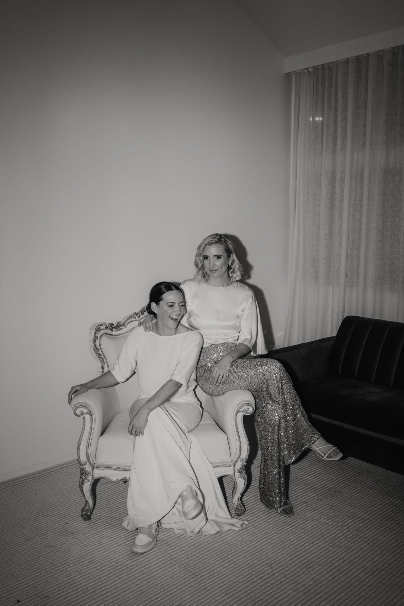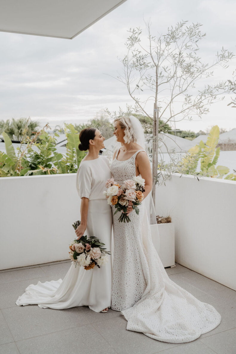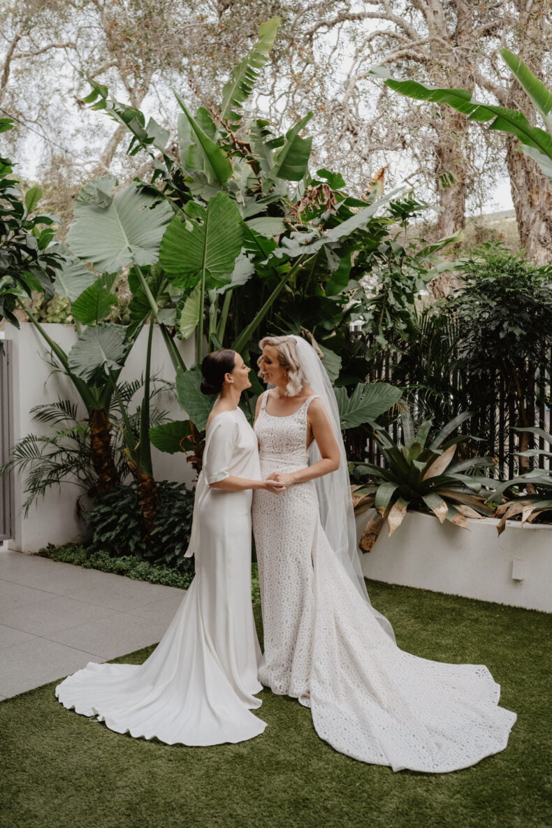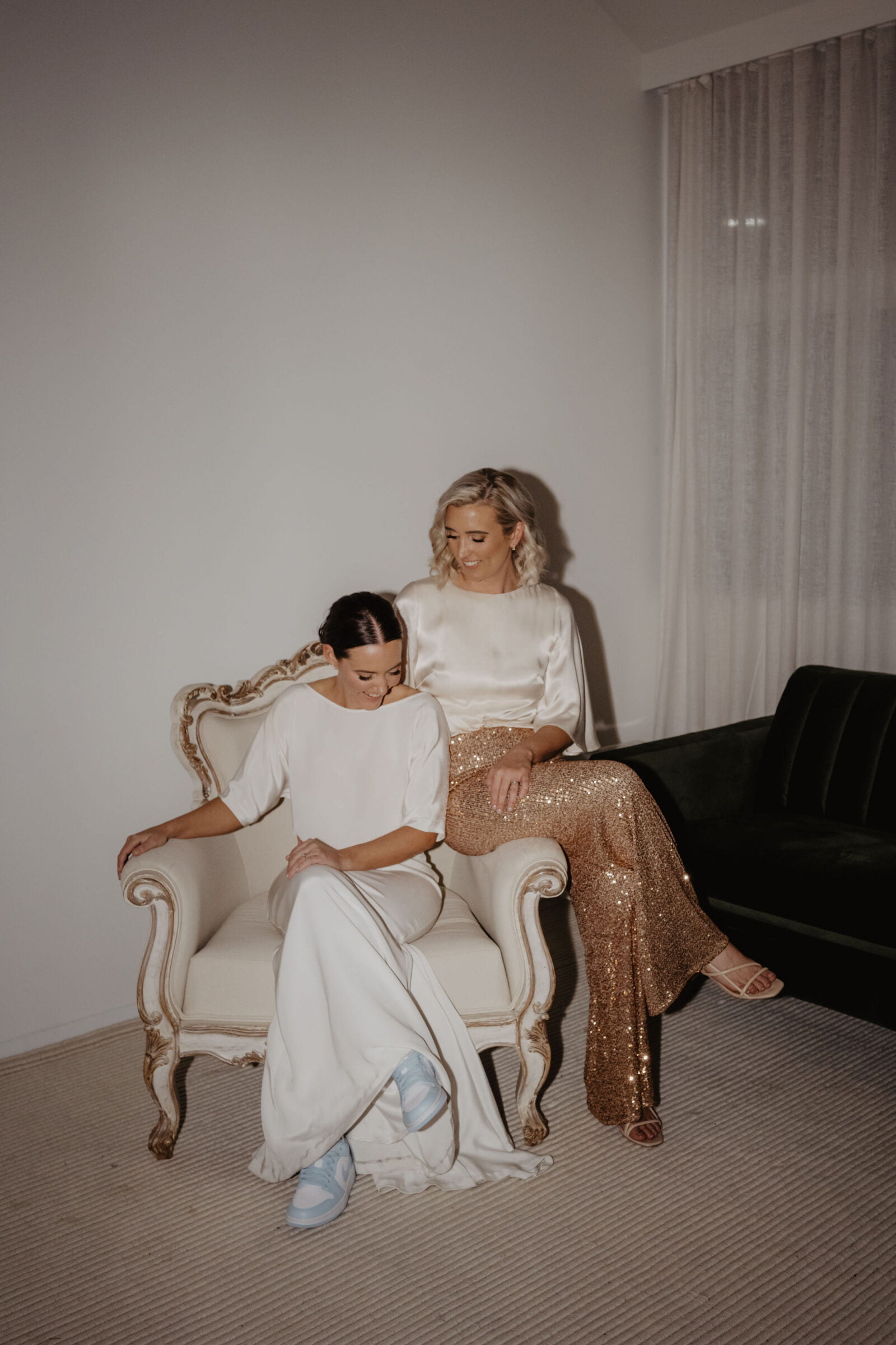 THE OUTFITS Shan: “We decided to go to each other’s bridal appointments because the only opinion that mattered to both of us was the other person’s. We also found this very useful to ensure we didn’t clash and complimented each other’s styles. Funny story… I purchased a dress not long after we were engaged. However, when the dress arrived, about four months before the wedding, the lace was damaged and could not be repaired. It was very stressful, but the lovely team at LUV Bridal came to my rescue. I knew that I didn’t want to wear a dress all night and wanted an amazing reception outfit to change into. Yes, the dress was beautiful, but I wanted to dance and move with ease. I found some FABULOUS gold sequin pants that were absolutely perfect to dance and party in. Cass: “I did quite a lot of research in the lead-up and knew exactly what I wanted. Shan forced me to try on A LOT of other dresses just to make sure I was sure. But when I tried on the Lola Varma Delphine skirt and Val top, I knew this was the one for me. The Jordans I wore at the reception were a fun touch. I wanted to be comfortable and be able to dance the night away.”