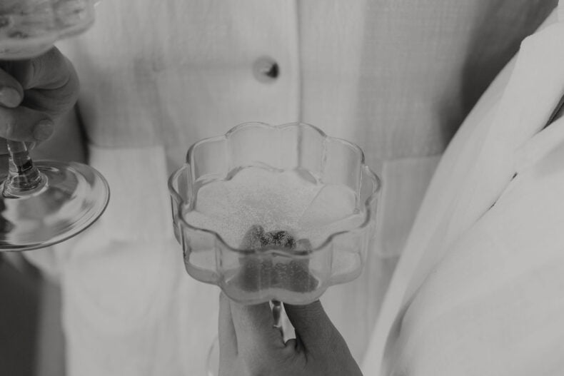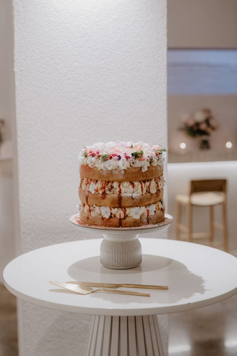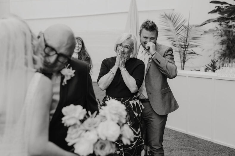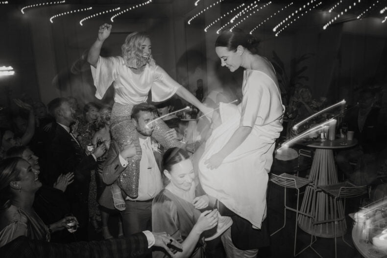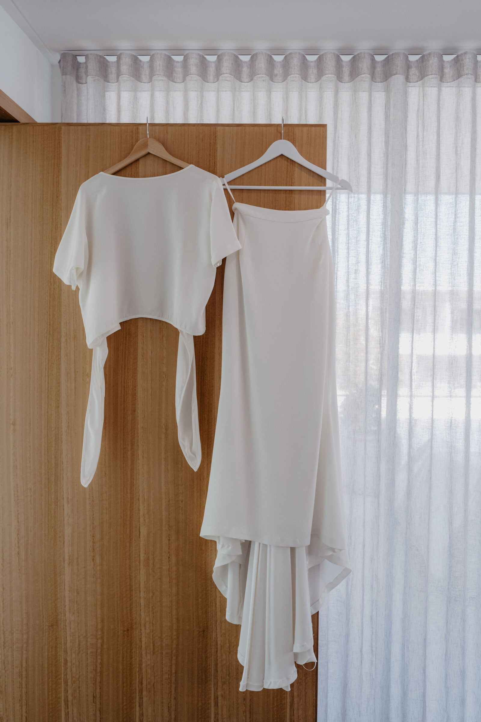 THE OUTFITS Shan: “We decided to go to each other’s bridal appointments because the only opinion that mattered to both of us was the other person’s. We also found this very useful to ensure we didn’t clash and complimented each other’s styles. Funny story… I purchased a dress not long after we were engaged. However, when the dress arrived, about four months before the wedding, the lace was damaged and could not be repaired. It was very stressful, but the lovely team at LUV Bridal came to my rescue. I knew that I didn’t want to wear a dress all night and wanted an amazing reception outfit to change into. Yes, the dress was beautiful, but I wanted to dance and move with ease. I found some FABULOUS gold sequin pants that were absolutely perfect to dance and party in. Cass: “I did quite a lot of research in the lead-up and knew exactly what I wanted. Shan forced me to try on A LOT of other dresses just to make sure I was sure. But when I tried on the Lola Varma Delphine skirt and Val top, I knew this was the one for me. The Jordans I wore at the reception were a fun touch. I wanted to be comfortable and be able to dance the night away.”