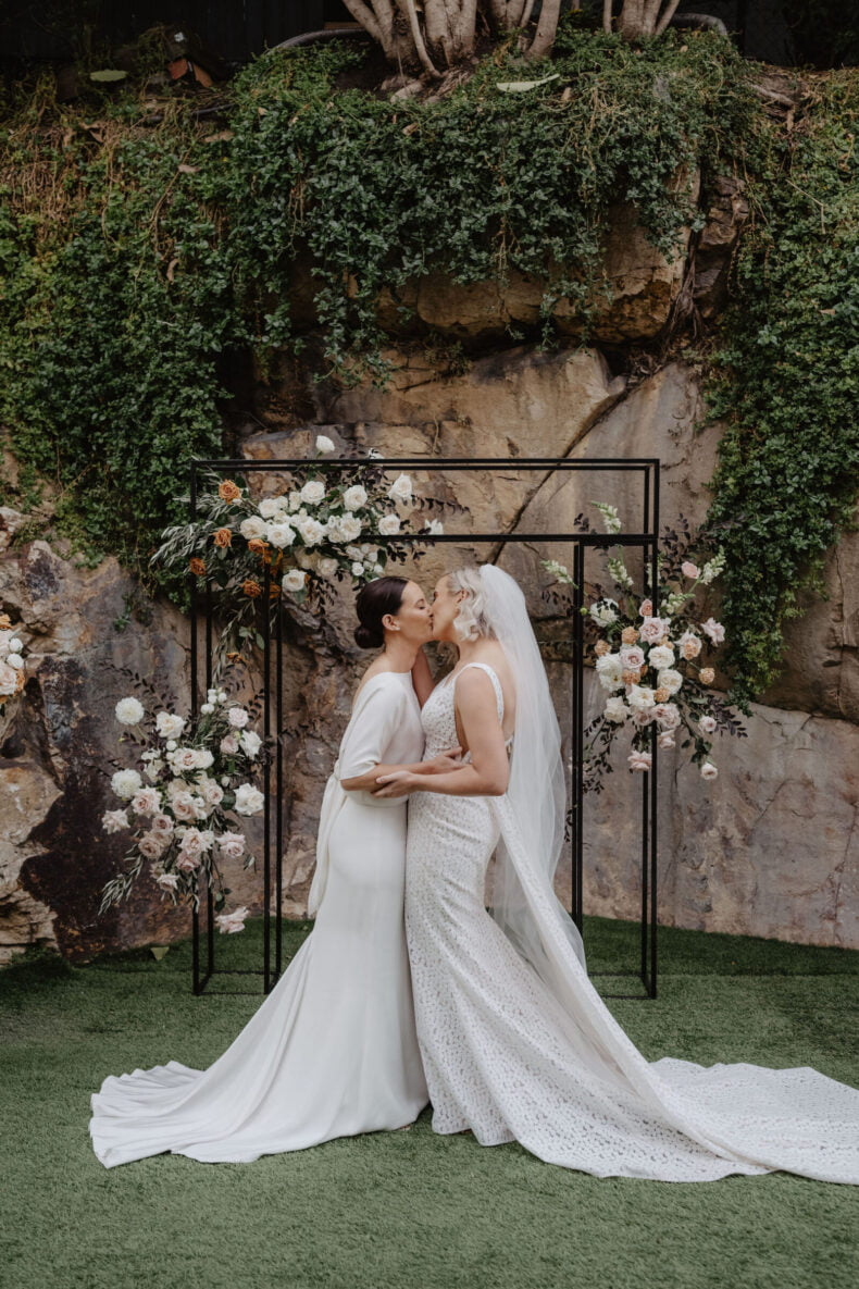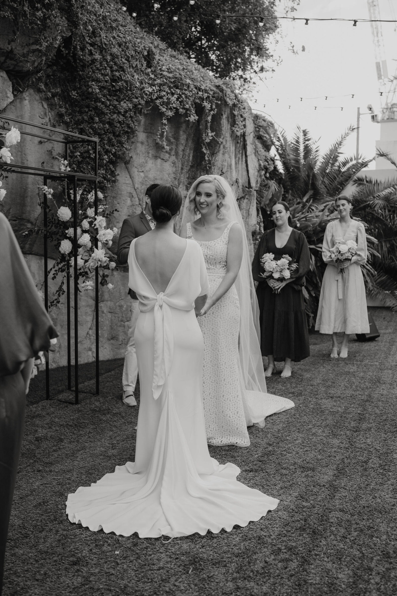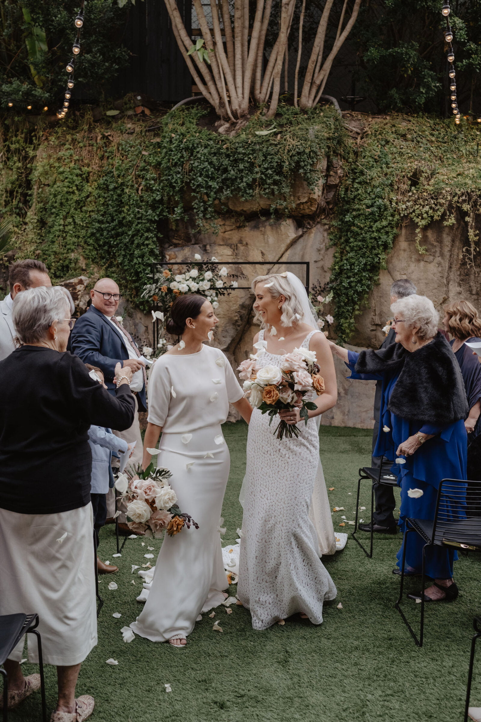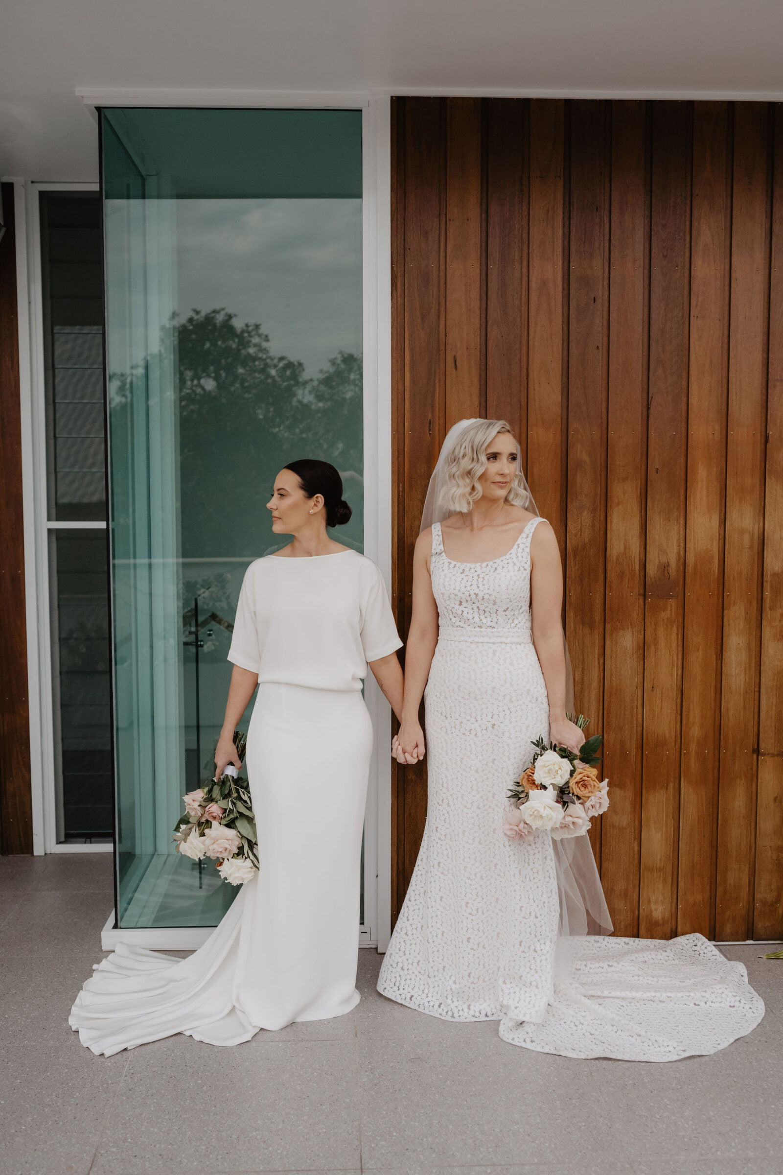 Shan and Cass crafted the perfect wedding that was them to a tee. From getting ready together, to their aisle entrance and outfit changes, this day was absolutely and totally theirs. “We wanted to include our fathers in walking us down the aisle, but rather than them ‘giving us away’ (as we are strong independent women), they walked us halfway down, before Cass and I walked the rest of the way together,” the newlyweds shared with us. Yas gals! Here. For. It. Locking in Taylor Kezia for snaps, Gwen Flower Co for blooms, Bared Footwear for heels, LUV Bridal for Shan’s dress and Cut a Rug to supply the tunes, were all very clever moves, too. Scroll down for this pair’s incred day…
