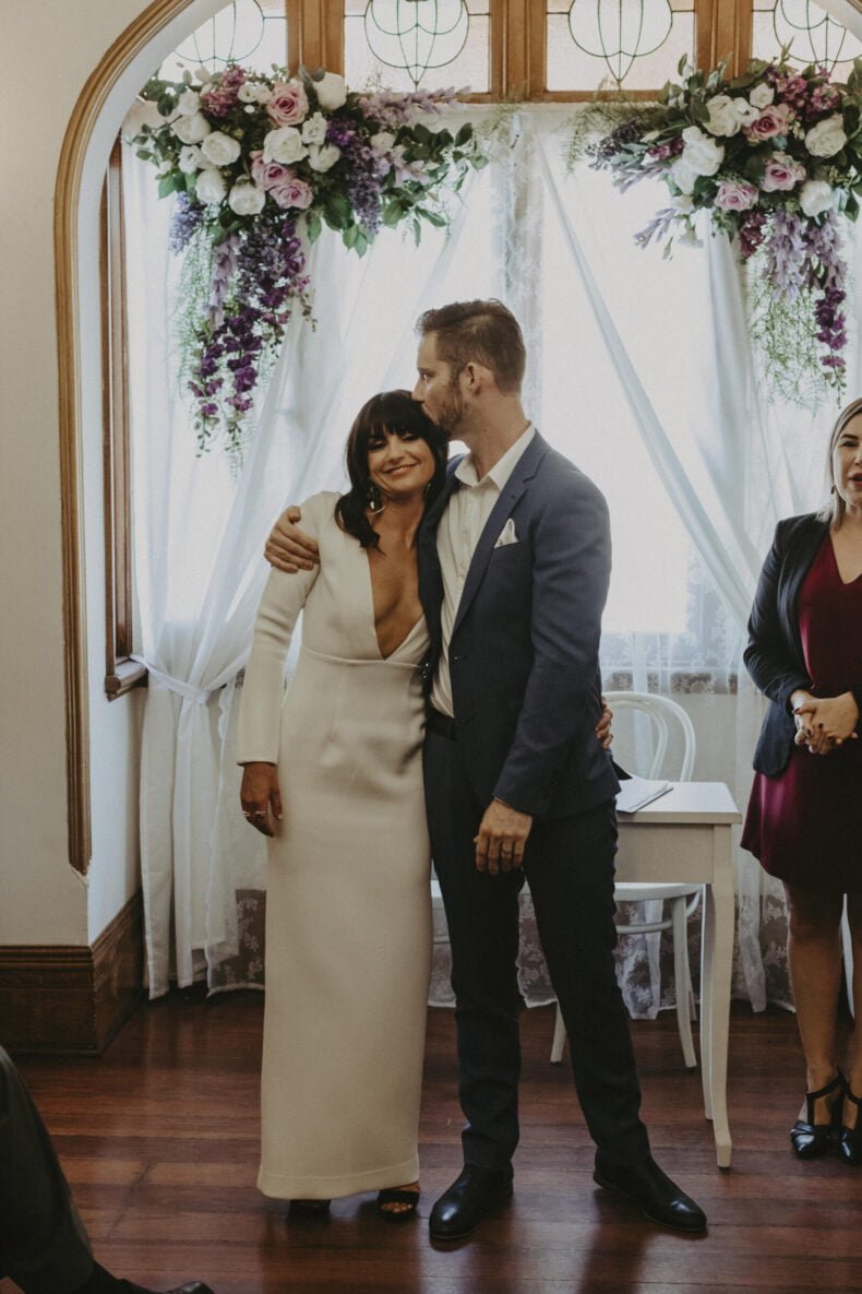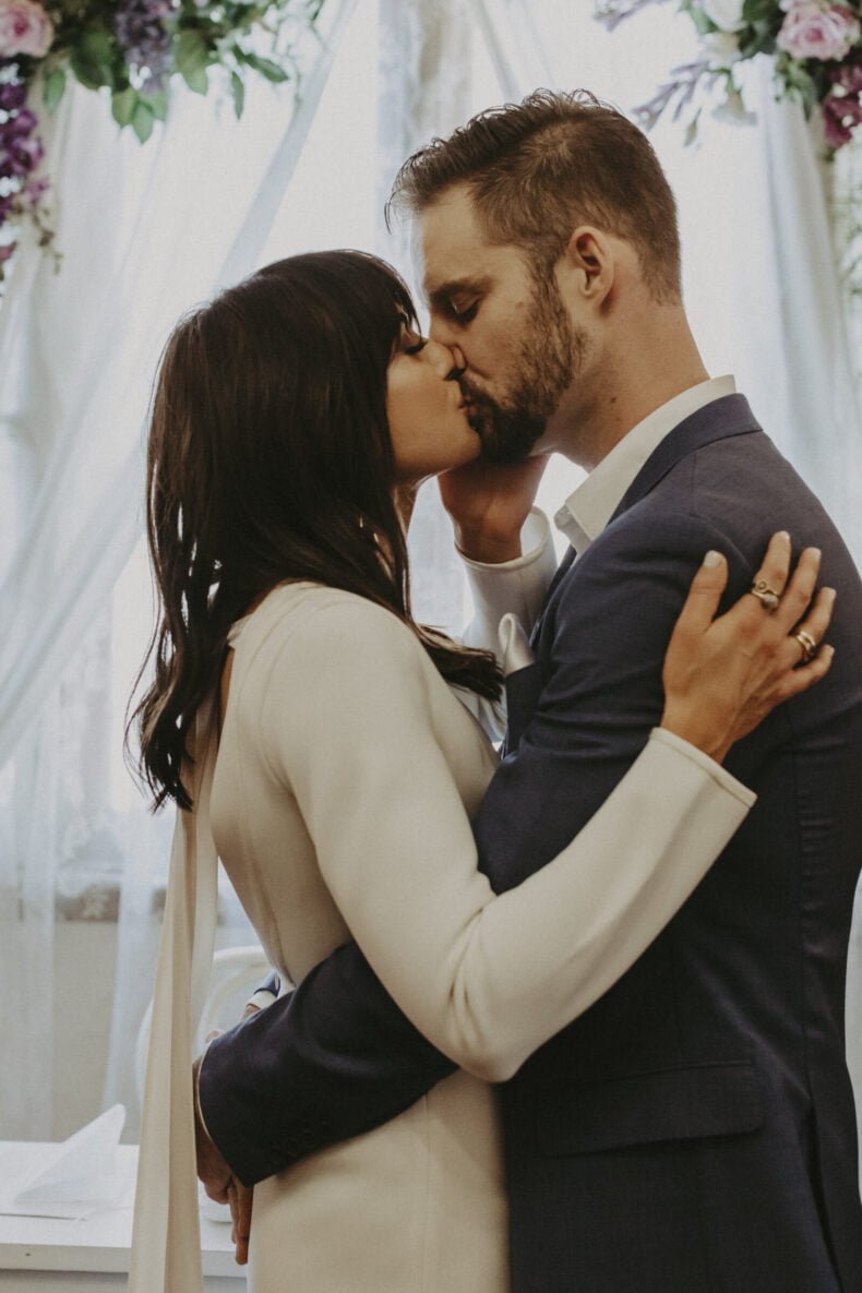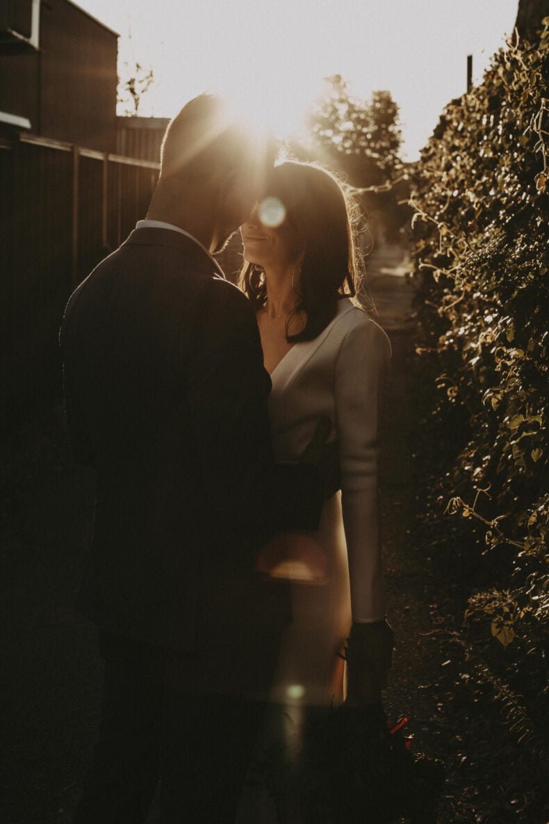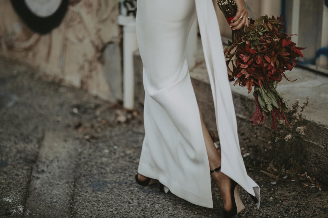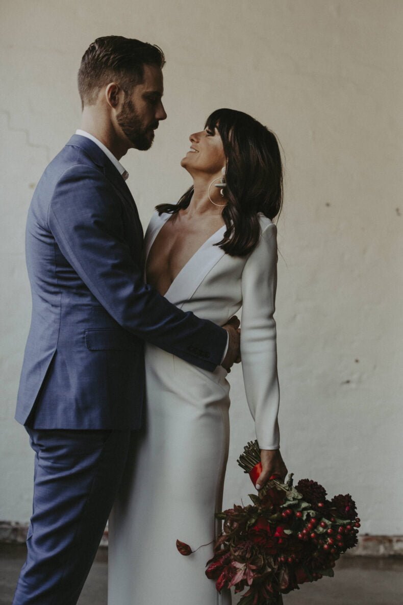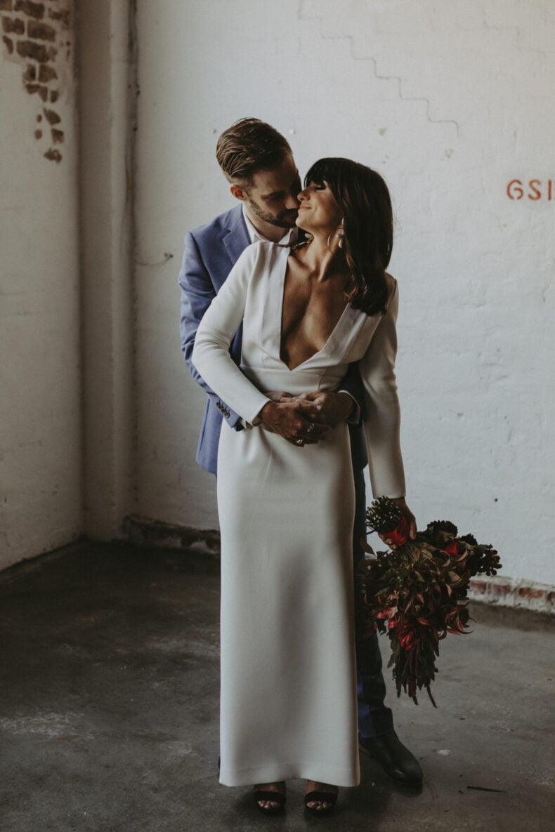 FAVOURITE MOMENT “I loved it when Ben and I went for our photos in a little alleyway around the corner from our reception. Prior to that, it had all been a bit of a whirlwind and go-go-go but by that point, we’d had a couple of drinks and had relaxed into the day a bit more, and also felt a lot more comfortable in front of the camera. James, and his second photographer Manny, did the most amazing job at helping us feel at ease, but when you’re not used to being in front of a camera it does take an hour or so to just let go. This hour or so we were away for before the reception started was a beautiful time in the afternoon and it was so great having that one-on-one time with Ben just laughing, cuddling, kissing and feeling so loved up. You can see all of that in the photos that James captured from that little sesh. I love looking back at them.”