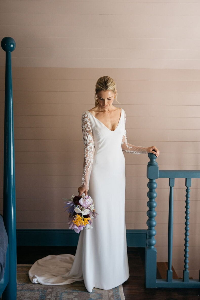 THE THEME “We drew on the grounds and interior design of Greyleigh when styling our wedding (e.g., invitations, signage, florals, my dress, and Todd’s suit jacket). For example, the ceremony flower towers by Fritillerie were designed to complement the opulent scenery and build on its beauty. We wanted them to look like they had sprung from the ground for the occasion.”