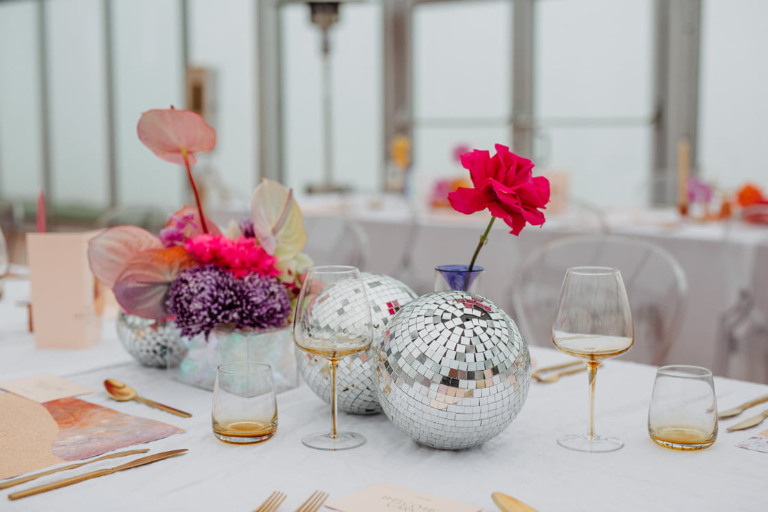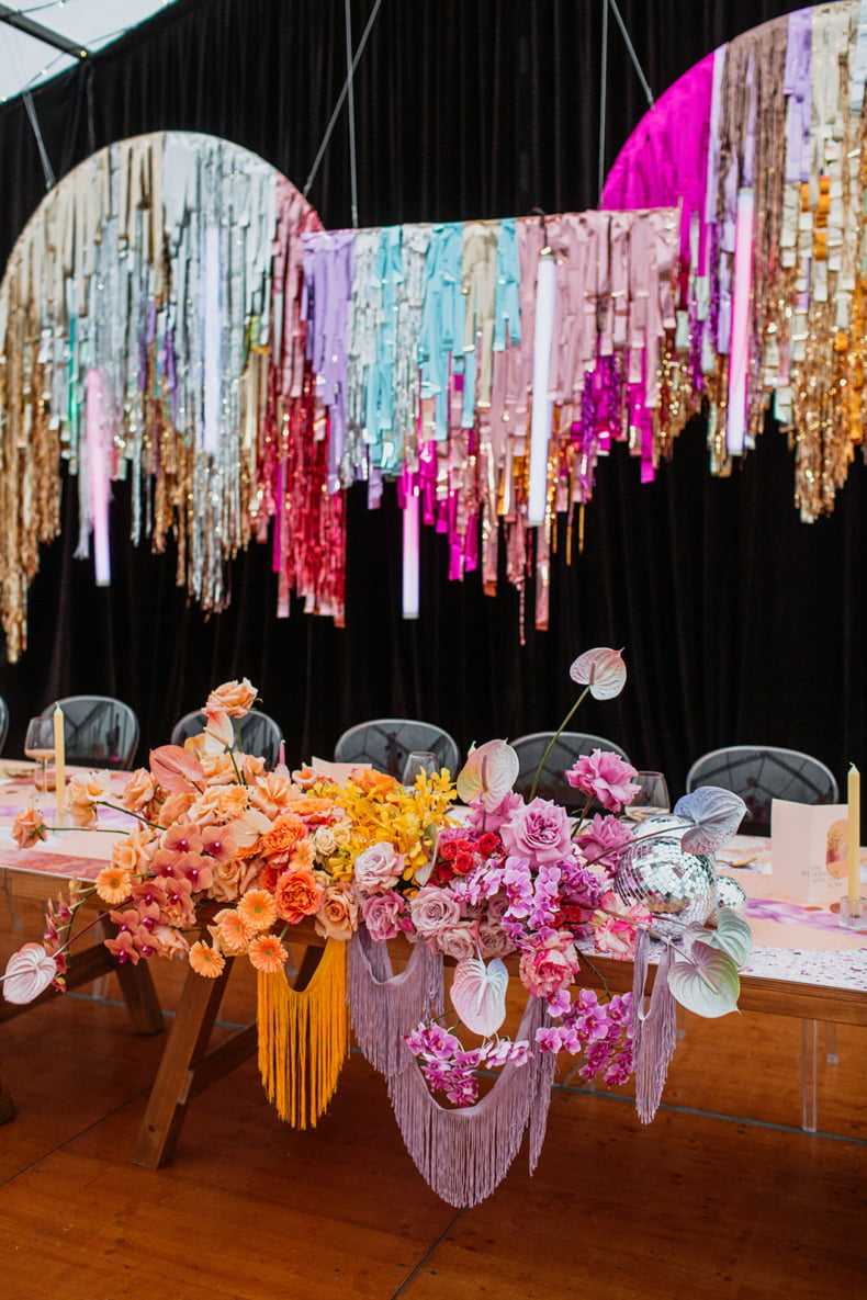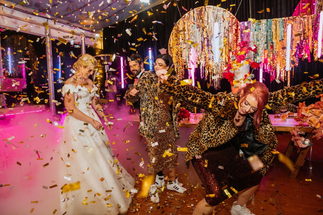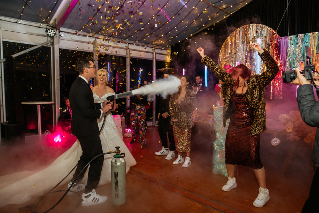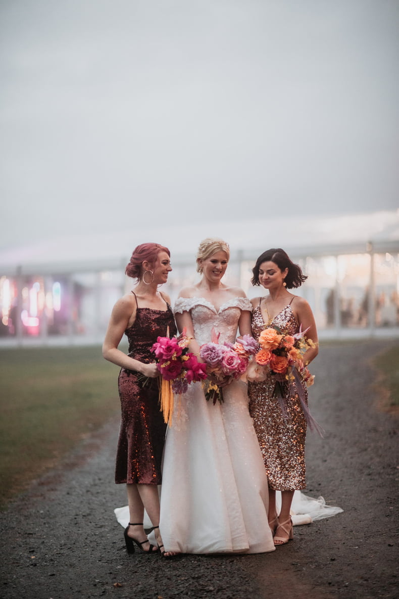 Alex & Koby’s “sunset disco” themed wedding is just the inspo you need this Monday morn. These two didn’t let the weather dampen their disco fever despite a rained out portrait sesh. Being the Studio Manager of Cloud Catcher Studio (the very collective that snapped these here pics), Alex called on her colleagues for a day after portrait session in the sun. All’s well that ends well, eh? With Mrs Gibbons on blooms and mates behind the lens, you’ll want to read on to learn more about this great day…