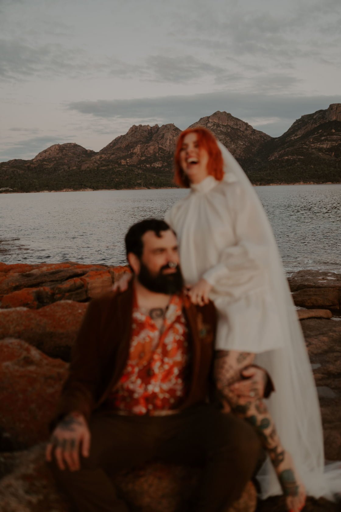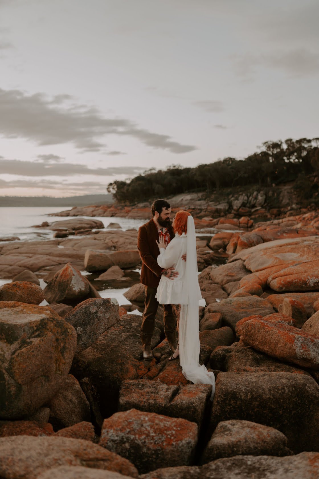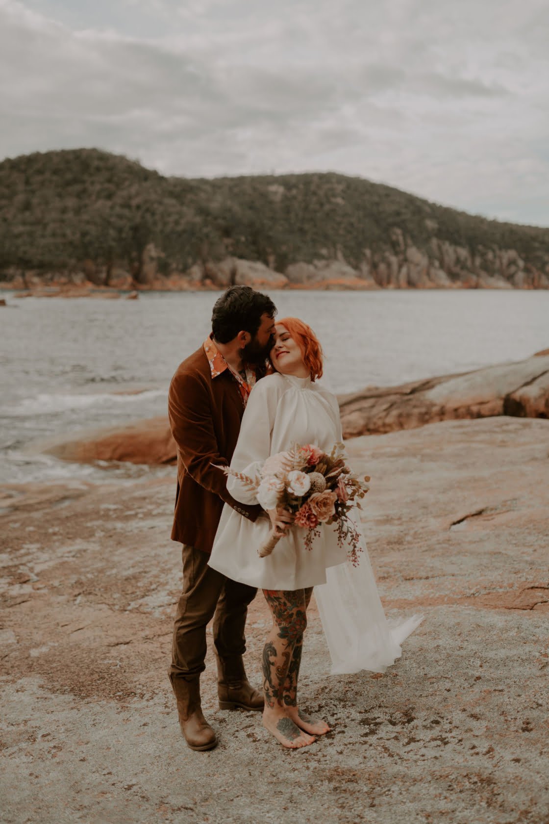 THE VENUE “We were originally going to have a small, intimate wedding with family and friends but COVID lockdowns were intense at that time and Matt and I were already living in different states so it all seemed a bit too hard and went on the back burner. Matt really wanted to visit Tasmania and I said “ why don’t we just elope?”. Matt’s a pretty private guy so he was keen to have a small, no fuss ceremony, and I have been married before so I didn’t want to do the whole massive wedding again. I spoke to a friend who lives in Tassie and she suggested Freycinet National Park as a beautiful Venue. Matt and I love nature so we wanted to immerse ourselves in it on our special day.”